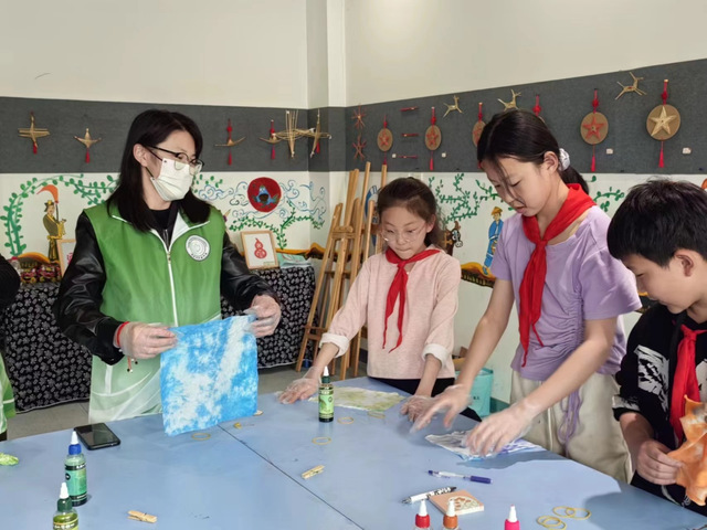 活动现场,老员工志愿者首先为小朋友们讲解了扎染的历史和制作工艺及技巧。之后,志愿者们带领小朋友们动手实践,扎染工艺分为扎结和染色两部分,志愿者们教小朋友们用绳子和小木棍将白布折叠、扎牢、定形,然后帮助小朋友们在白布上涂上五颜六色的颜料,创造出属于自己的扎染作品。