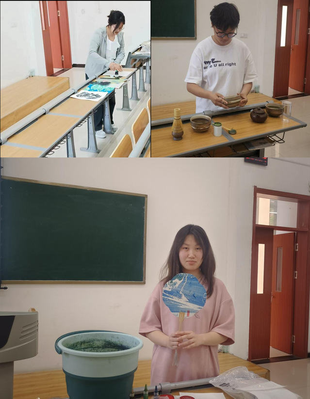 会议上漆扇、扎染、剪纸等共计7个非遗小组依次登台,通过作品展示和路演来介绍项目的缘起、进展和计划,不少同学坦言在对非遗技艺的深入了解中更加感受到中华优秀传统文化的魅力,也坚定了要做文化传播者的信心。仇老师认真倾听每一组同学的讲解,凭借丰富的经验和专业知识,耐心地指出了各组中存在的问题,并提出在如今文创如火如荼开展的今天,开展非遗大创要立足当下,服务地方,用青年人喜闻乐见的形式来创作,并借助网络进行积极传播。
