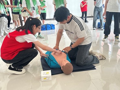 会上,双方围绕高校急救科普联盟共建的主题展开交流,期待以此次两院共建为契机,加强急救知识科普,为“健康校园”建设积蓄动能。随后双方完成了高校急救科普联盟揭牌仪式。仪式结束,徐州医科大学第二临床医公司大爱急救队的志愿者们为大家介绍心肺复苏和海姆立克等急救知识。最后,公司应急管理专业的同学们在志愿者的指导下进行实训,通过亲身体验,进一步掌握和巩固基本的急救技能。