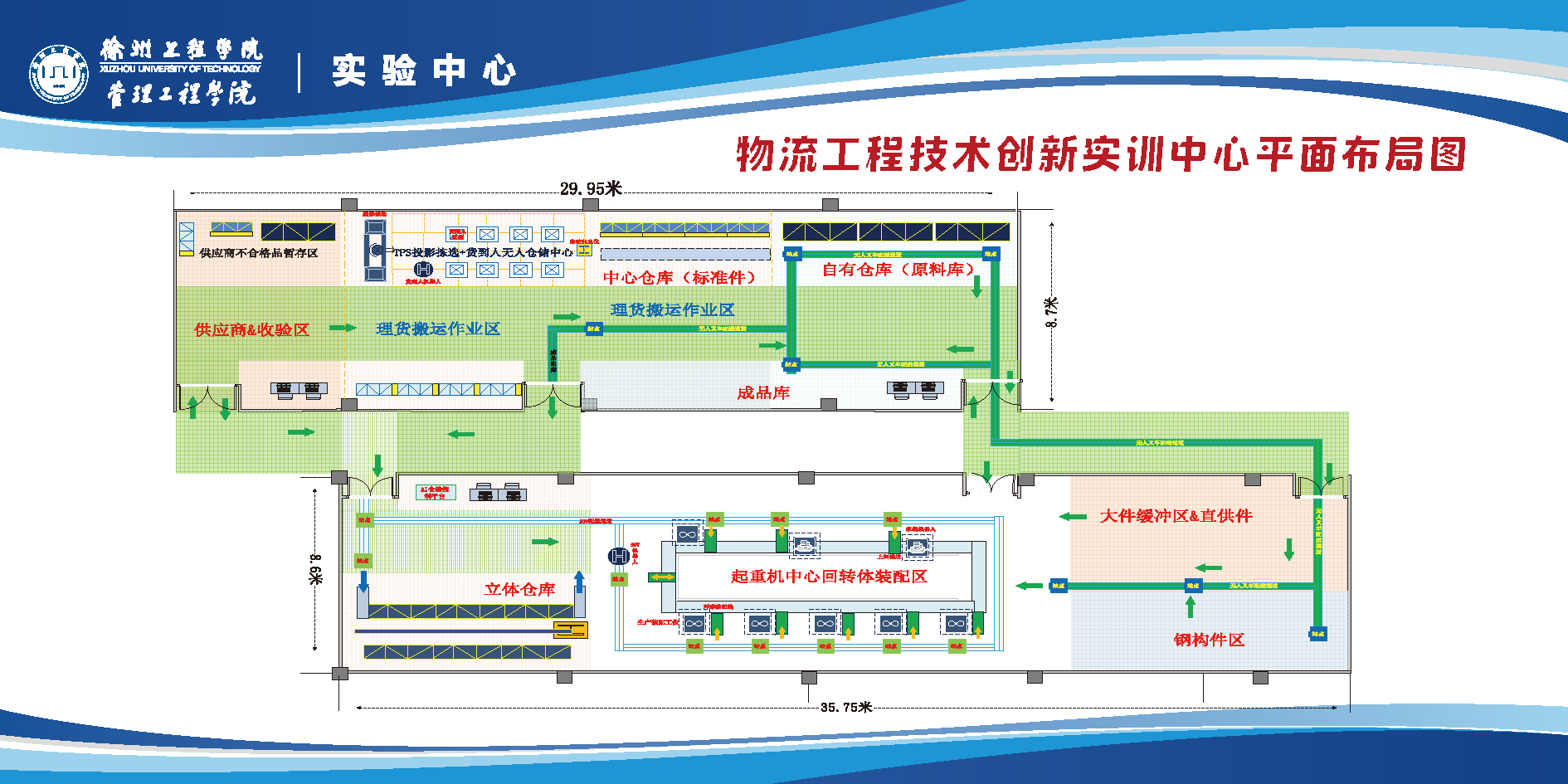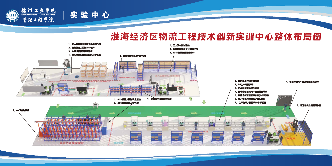 淮海经济区物流工程技术创新实训中心采用“货到人机器人配送技术+语音拣选技术+5G通信技术+人工智能技术+物流信息技术+自动化控制技术+工业机器人控制技术”等技术,打造集“原材料收货、生产自动叫料、AGV自动齐套上料、产品装配、成品下线、自动化立体存储”等实习实训教学内容于一体的物流工程技术创新实验室。