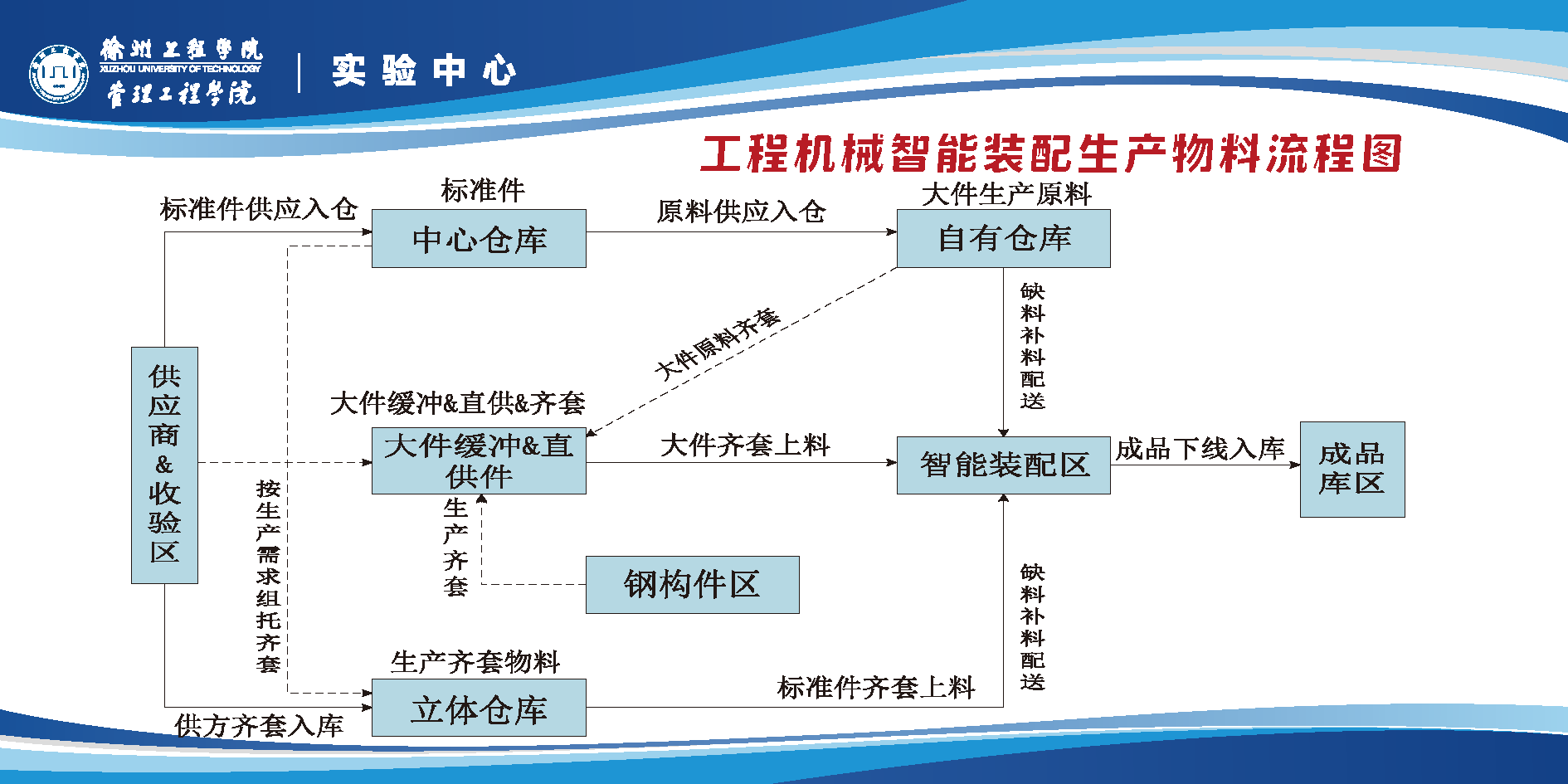 该实验室模拟徐工集团重型机械关键部件装配机器人系统、3D视觉辅助检测系统、自动化立体仓库系统、AGV产线物料搬运系统、线边库存系统、线边叫料ANDON系统、装配线物料齐套配送分拣系统、智能制造产线数据采集系统、产线MES执行系统、产线与物流大数据分析系统、产线及其物流大数据同屏看板显示系统等线边物流系统。把徐工集团重型机械相关生产线的线边物流“搬”到实验室,具有高度的仿真性,能够直观地展示生产线各个环节的物流信息,帮助员工更好地理解和掌握智能制造相关物流技术。